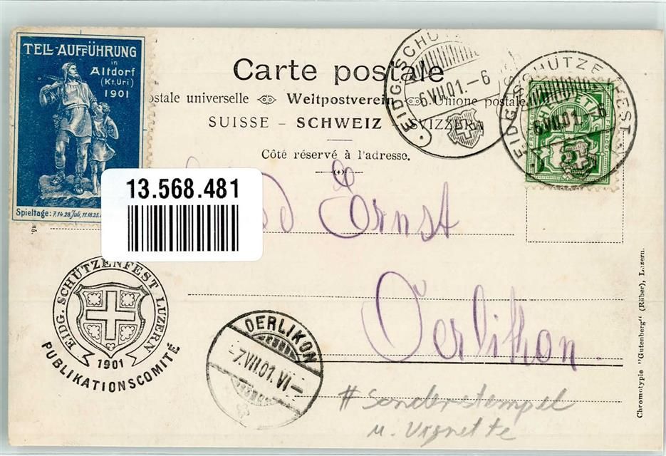 6000 Luzern Lucerne 1901 Lithographie Schützenfest Eingang Festhalle Sonderstempel Vigentte Tell