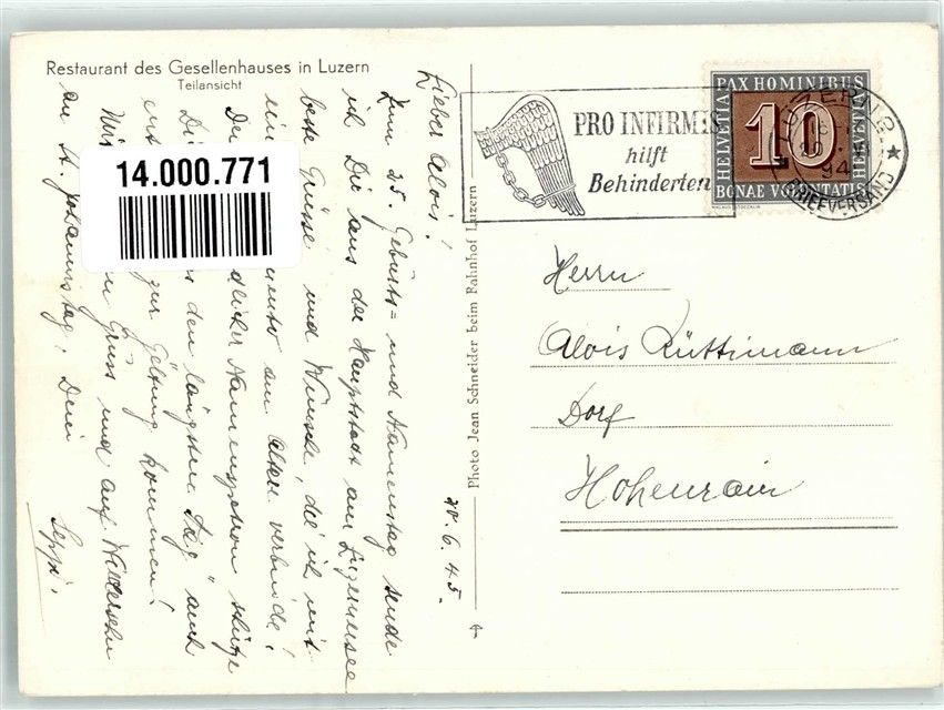 6000 Luzern Lucerne 1945 Foto AK Gasthaus des Gesellenhaus Pro Inrimis hilft Behinderten Stempel