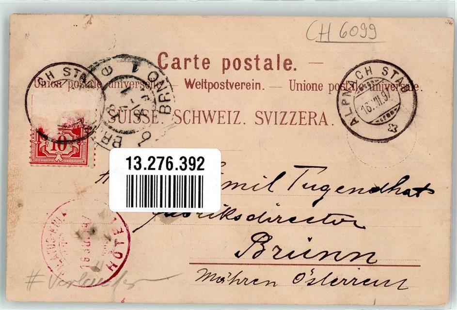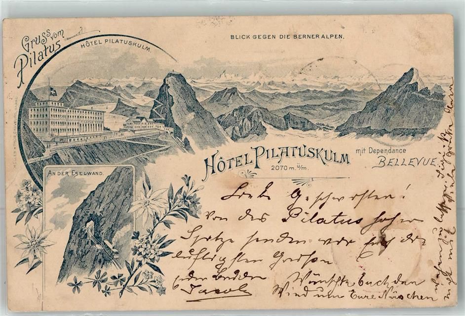 6010 Kriens 1897 Gebrauchsspuren Hotel Pilatuskulm mit Dependance Bellevue an der Eselwand Lithographie Vorläufer