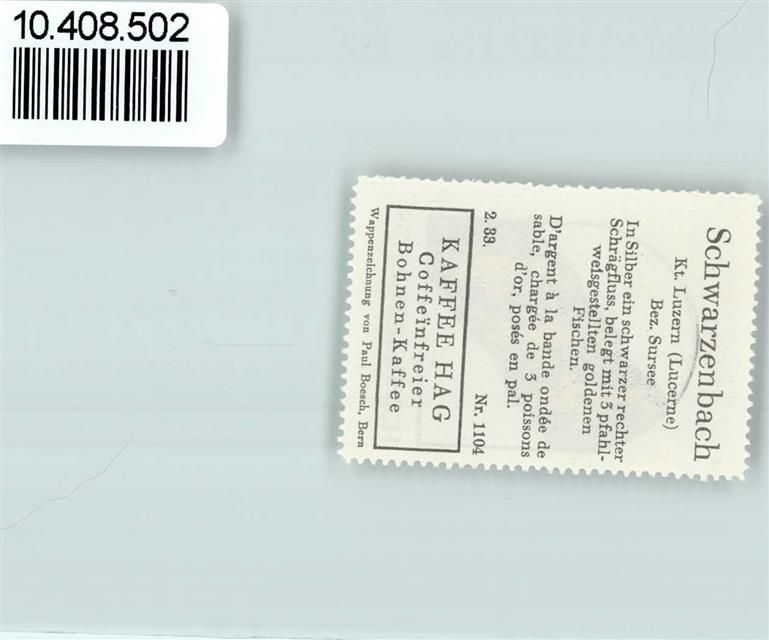 Schwarzenbach , Vignette Wappen Kaffee Hag ca 1920-1940 Fische