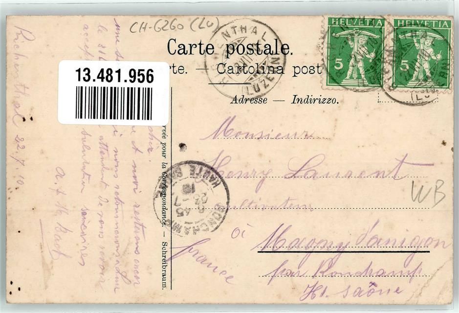 6260 Reiden 1910 Gebrauchsspuren Kur- und Wasserheilanstalt Richenthal Lithographie