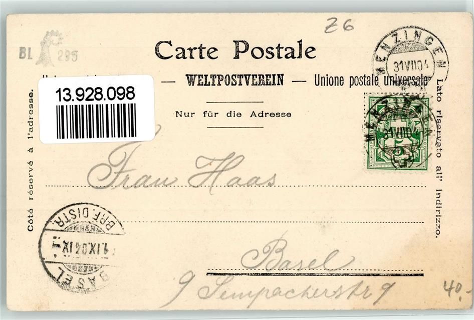 6313 Menzingen 1904 - Ort lt. Stempel