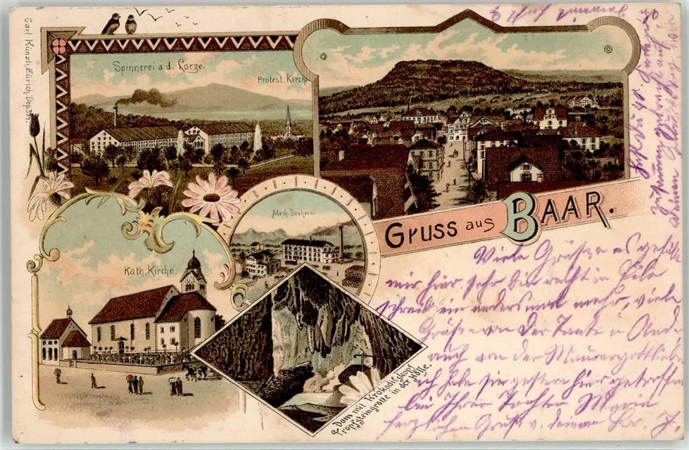6340 Baar 1899 Lithographie Fabrik spinnerei Kath. Kirche Höhle