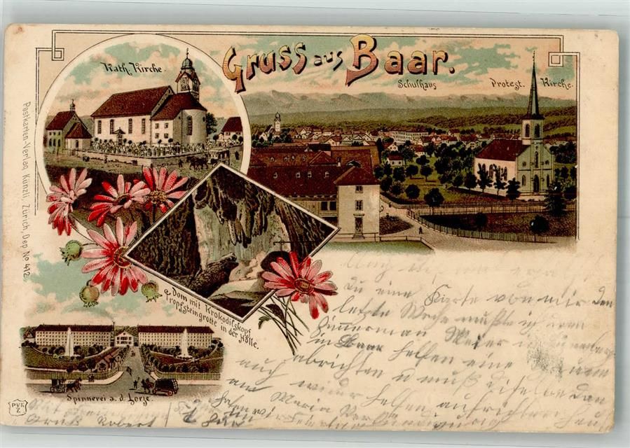 6340 Baar 1902 Lithographie Fabrik Spinnerei a.d.Lorze Höhle Kath. Kirche Protes. Kirche
