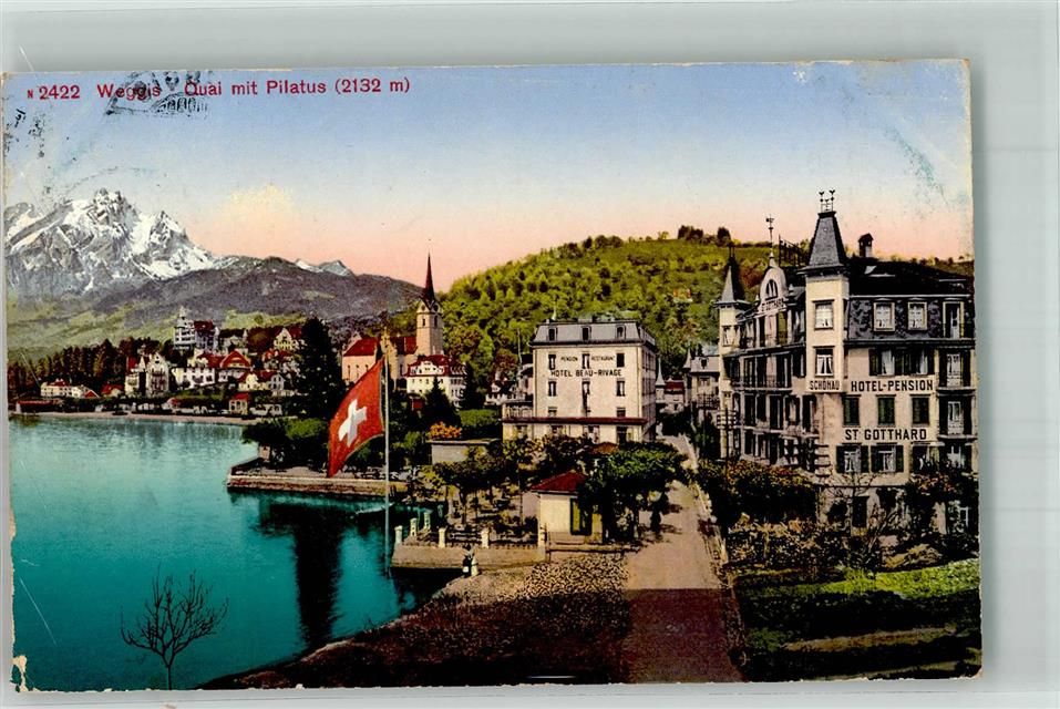 6353 Weggis 1913 Foto AK Hotel Pension St. Gotthard Quai mit Pilatus