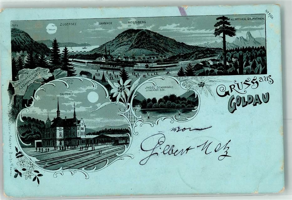 Goldau, Insel Schwanau Löwerzer See Bahnhof Lithographie/Mondschein
