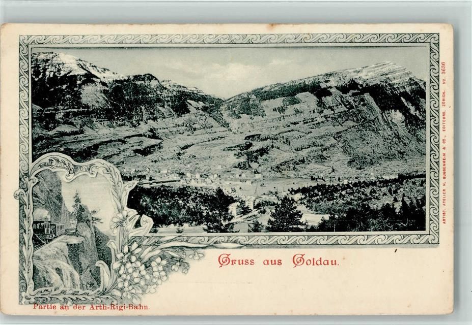 6410 Goldau 1899 Gebrauchsspuren Gruss aus - Rigi Bergbahn , vue generale, Verlag Guggenheim Nr. 3636