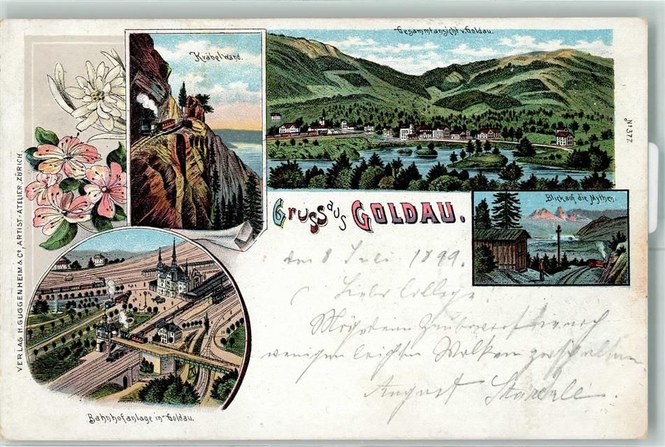 6410 Goldau 1899 Lithographie Kräbelwand Bahnhofanlage Blick auf die Mythen