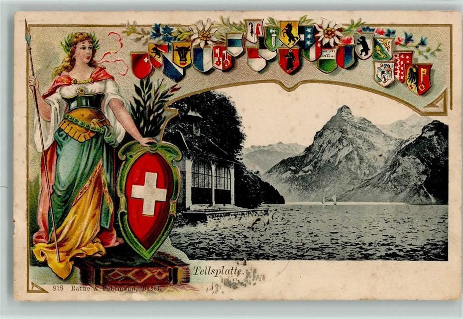 Sisikon, Prägedruck Tellsplatte Helvetia Wappen Lithographie