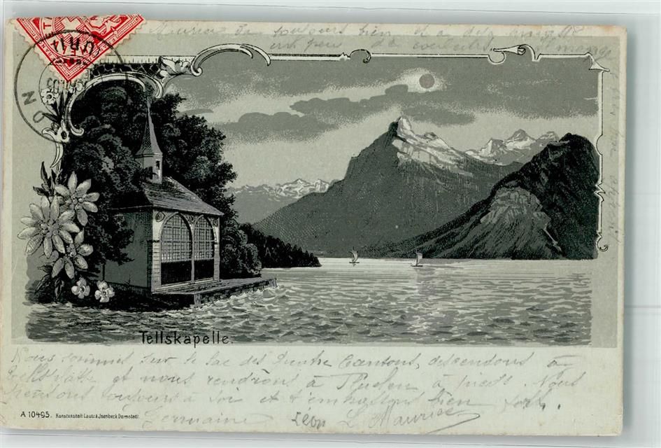 6452 Sisikon 1905 Lithographie / Mondschein Tellskapelle Segler