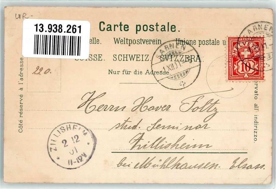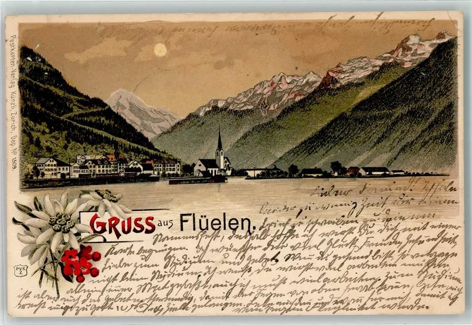 6454 Flüelen 1901 Lithographie / Mondschein Gruss Kirche Blumen Mond