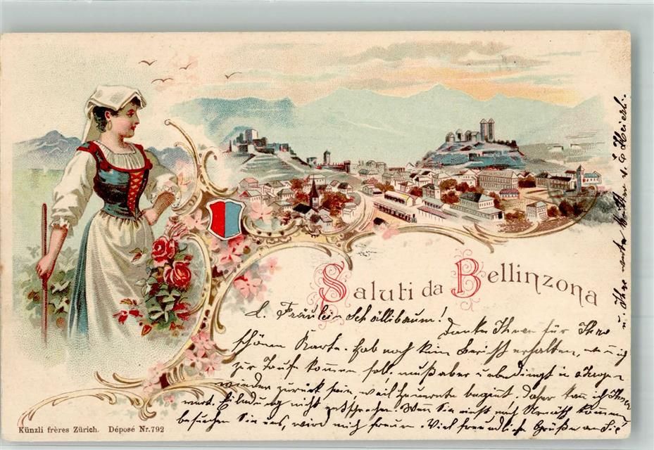 6500 Bellinzona 1900 Lithographie Tracht Frau Burg Eisenbahn