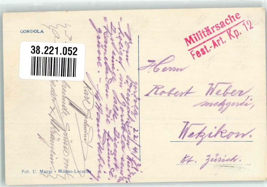 Gordola, Feldpost Militärsache Fest.-Art.Kp. 12