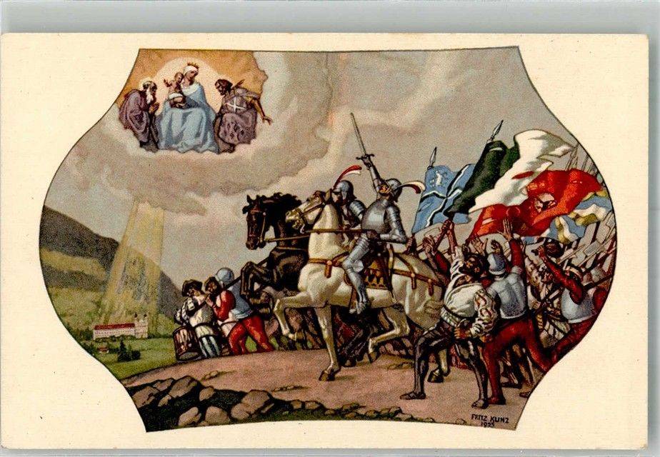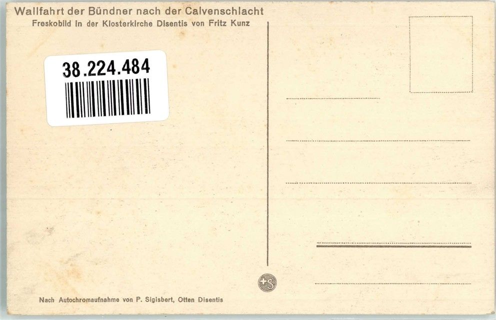 7180 Disentis Mustér Foto AK Kirche Freskobild Wallfahrt der Bündner n.d.Calvenschlacht sign. Kunz, F.