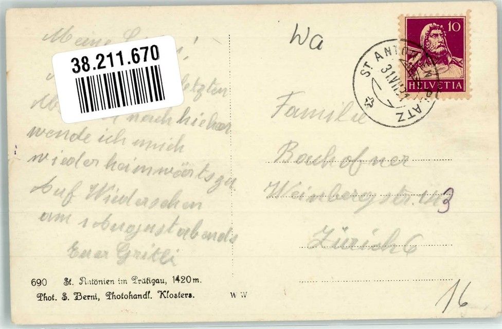 7246 St. Antönien 1931 Foto AK Kirche