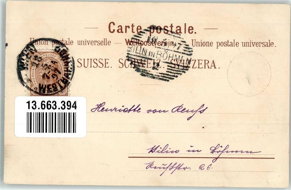 7435 Splügen 1897 Gebrauchsspuren Hotel Bodenhaus Gruß vom Splügen Lithographie