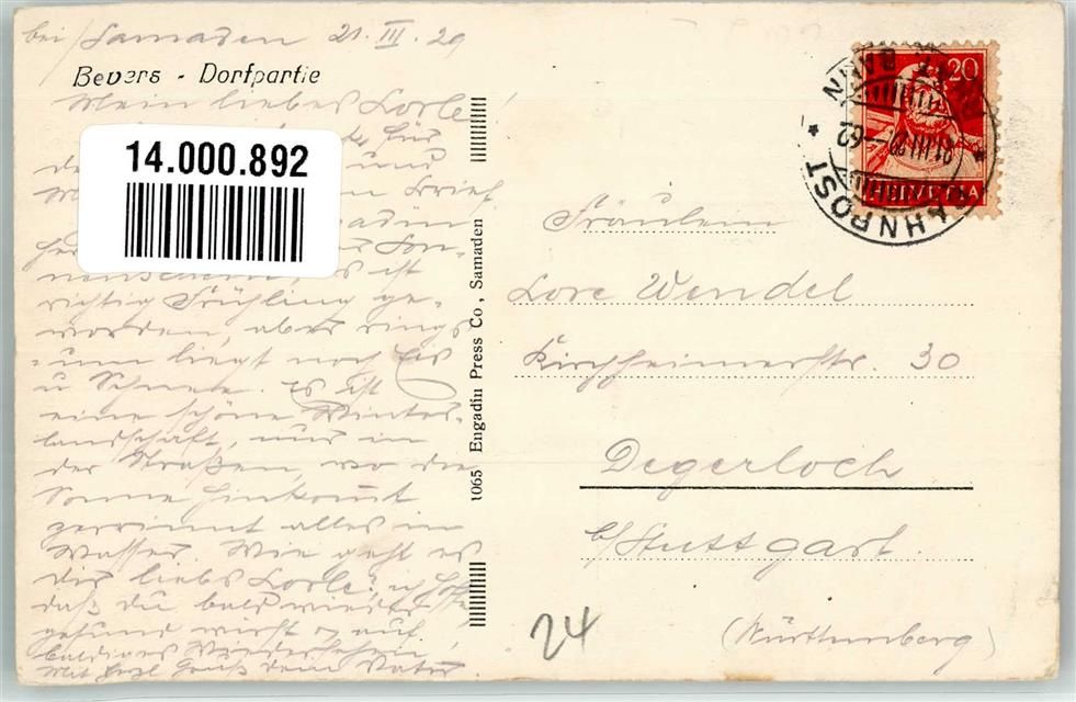 7502 Bever 1929 Winter Dorfpartie Bahnpost Zug 62
