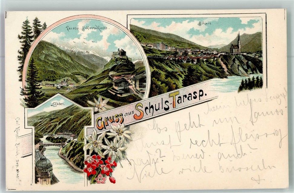 7550 Scuol Schuls 1897 Lithographie Schloss Kirche Hotel bäder Adelskorrespondenz