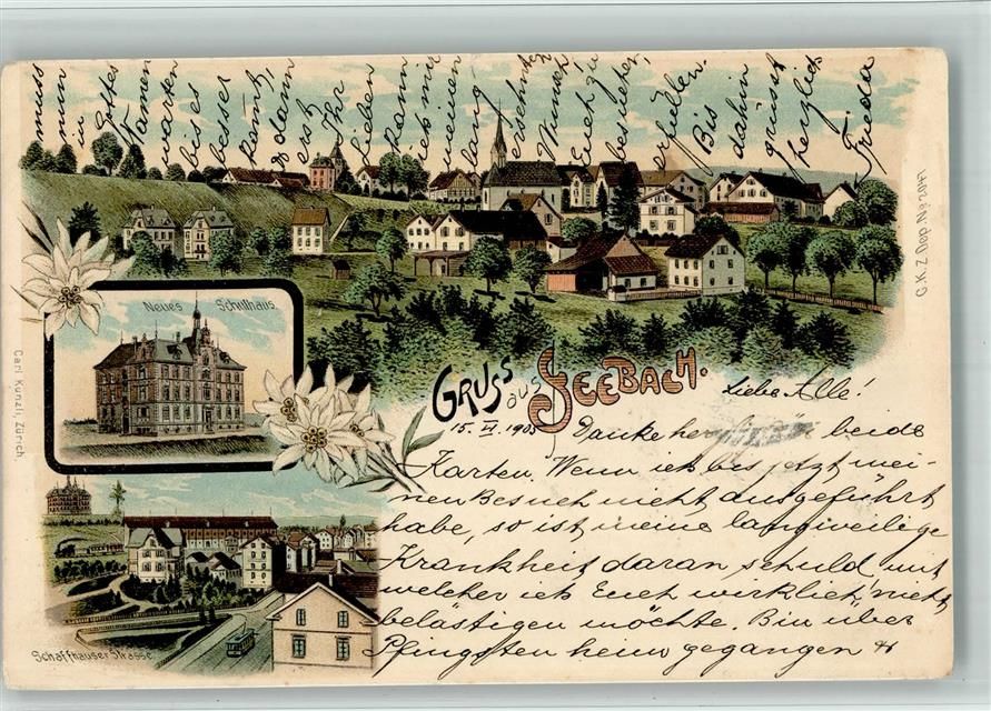 Seebach, Lithographie Neues Schulhaus Schaffhauser Straße Straßenbahn Büge Verlag Künzli Nr 2047 Gebrauchsspuren, bitte Scan genau beachten!