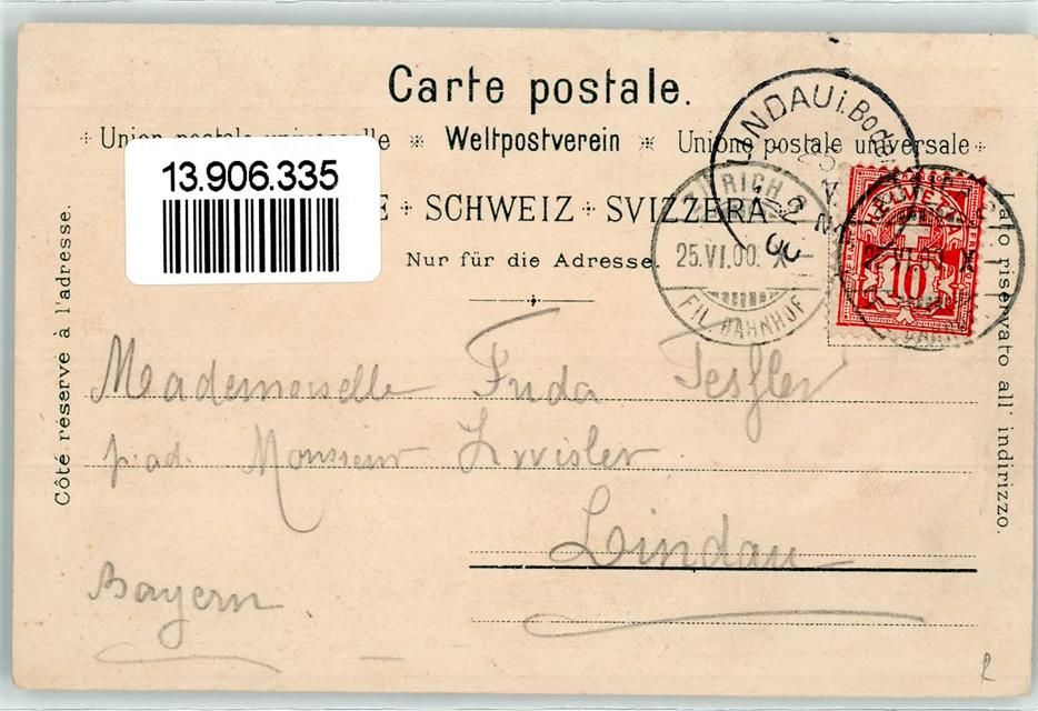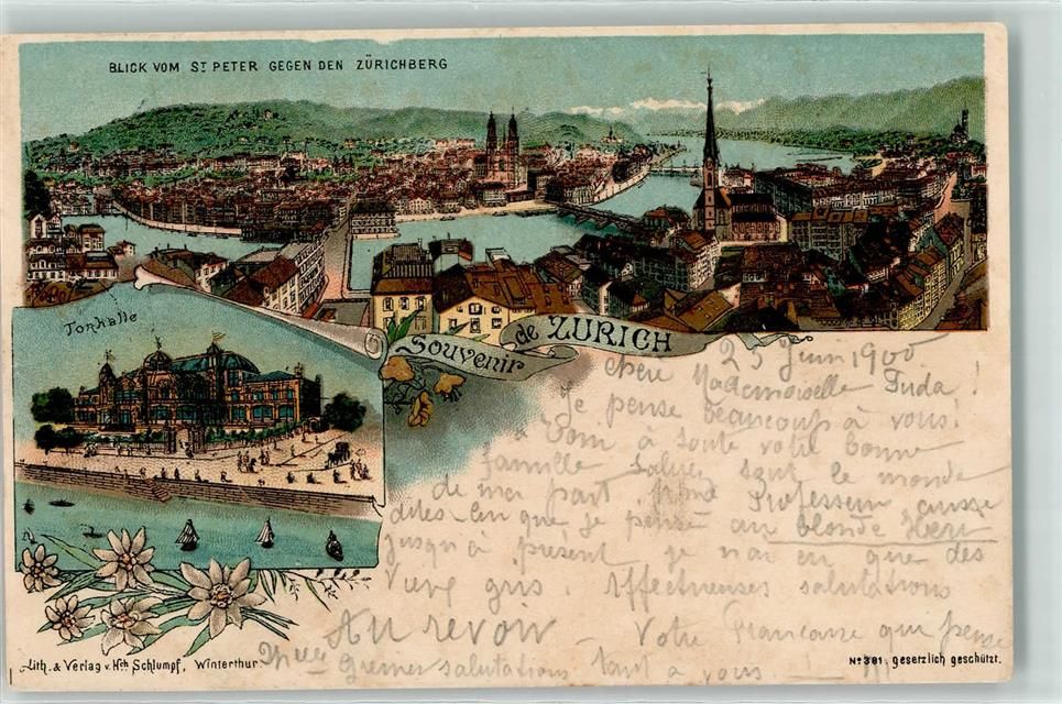 8000 Zürich 1900 Lithographie Zürichberg Kirche Tonhalle Schiff Boot Blumen Brücke