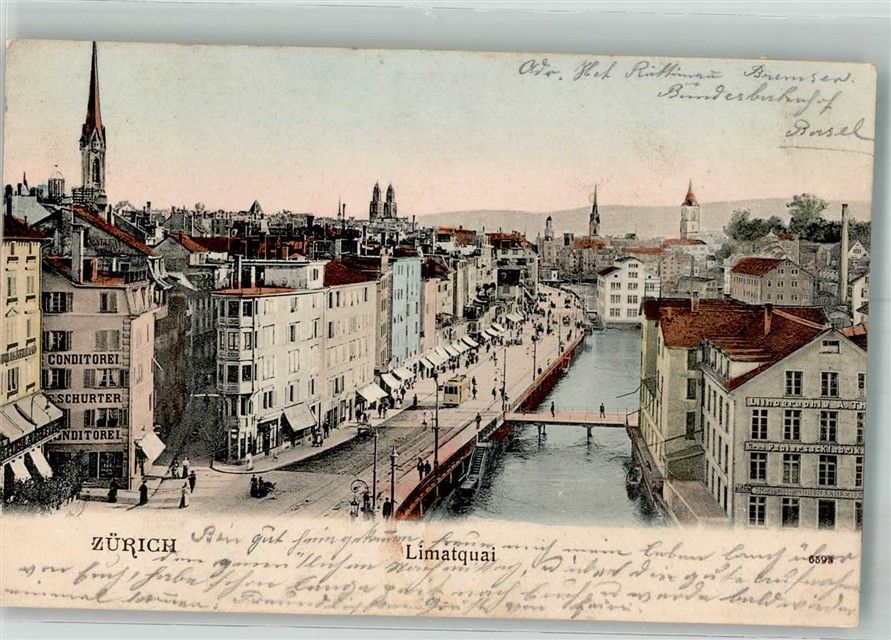 8000 Zürich 1903 Foto AK Limmatquai Cafe Schurter Straßenbahn Papiersack-Fabrik