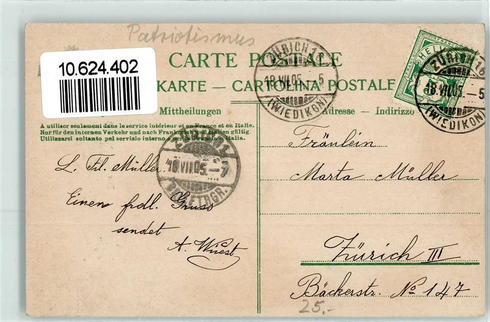 8000 Zürich 1905 - Helvetia Zur Erinnerung an das Eidg Sängerfest