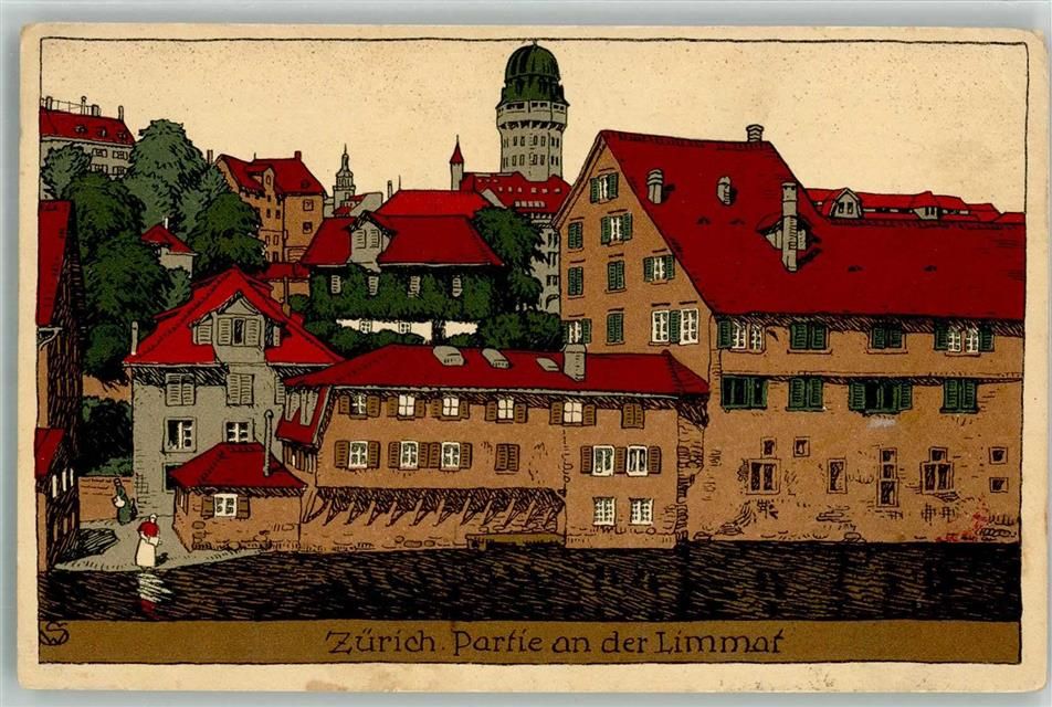 8000 Zürich 1919 Gebrauchsspuren An der Limmat Künstlersteinzeichnung