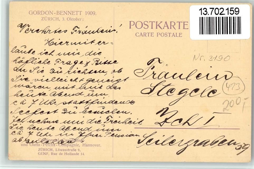 8000 Zürich BOAKC Gordon-Bennett 1909 Sieger Ballon Helvetia 1908