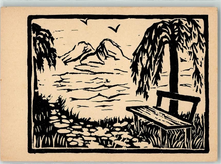 8000 Zürich Künstlerkarte Linolschnitt Arbeitsstube für körp. beh. Frauen und Töchter Sitzbank unter Baum und Berge