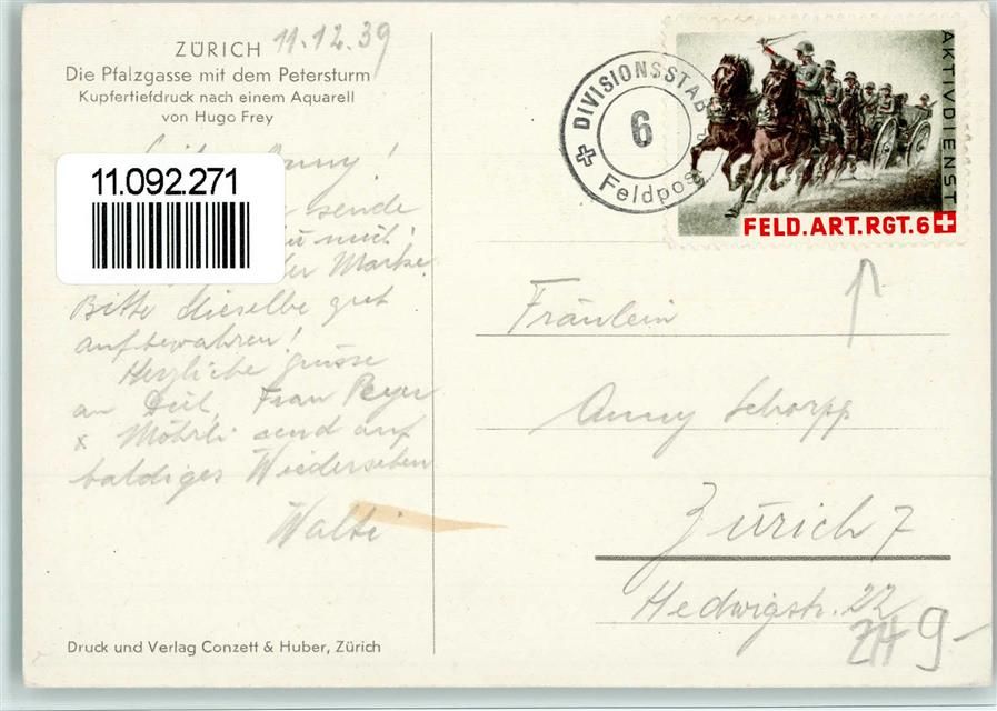 Zürich, Pfalzgasse mit Petersturm sign Hugo Frey