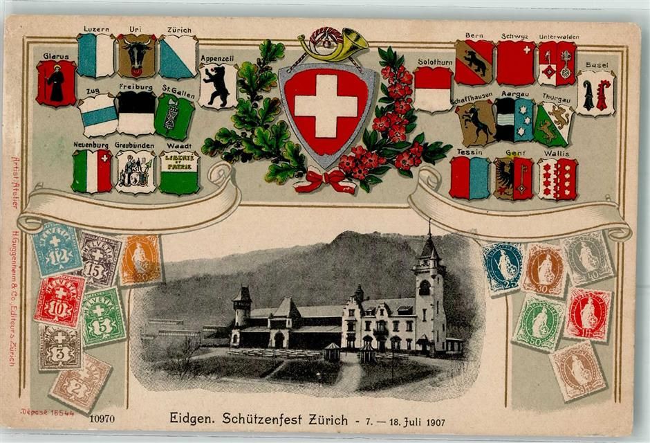 Zürich, Eidgen. Schützenfest Juli 1907 Wappen Briefmarkenabbildungen Lithographie
