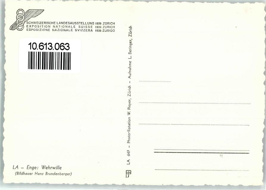 8000 Zürich - Schweizerische Landesaustellung Wehrwille Plastik von Hans Brandenberger