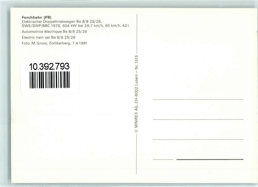 8127 Forch - Forchbahn FB Elektrischer Doppeltriebwagen Be 8/8 25/26 SWS/SWP/BBC 1976 604 kW bei 29,7 km/h 65 km/h 42 t