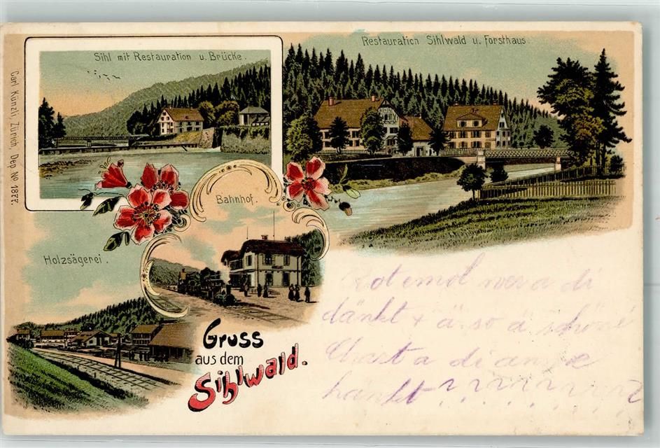 8135 Sihlwald 1900 Lithographie Gasthaus Brücke Forsthaus Holzsägerei Bahnhof Verlag Künzli Nr 1877