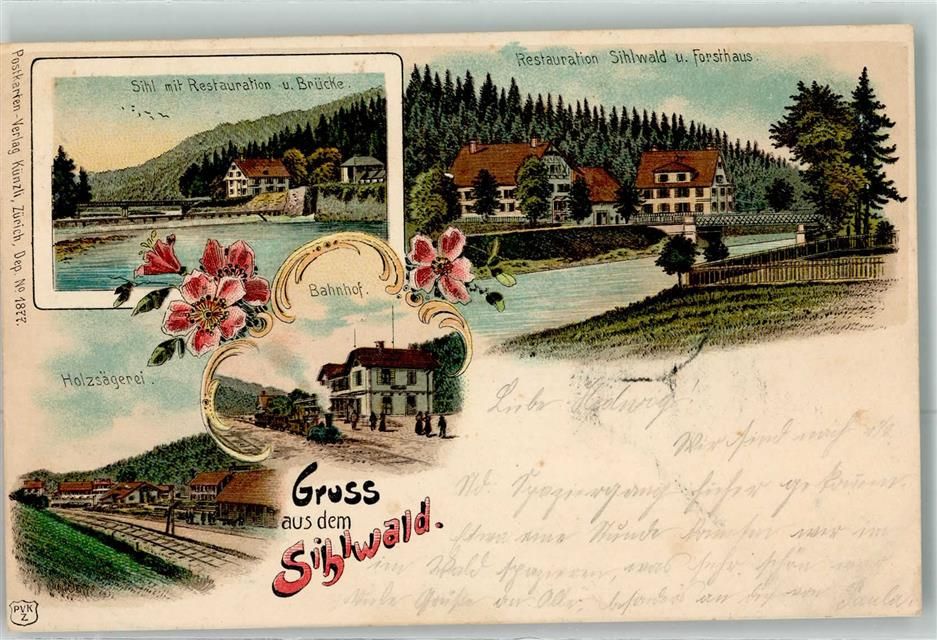 Sihlwald, Sihl Gasthaus Brücke Forsthaus Holzsägerei Bahnhof Verlag Künzli Nr 1877