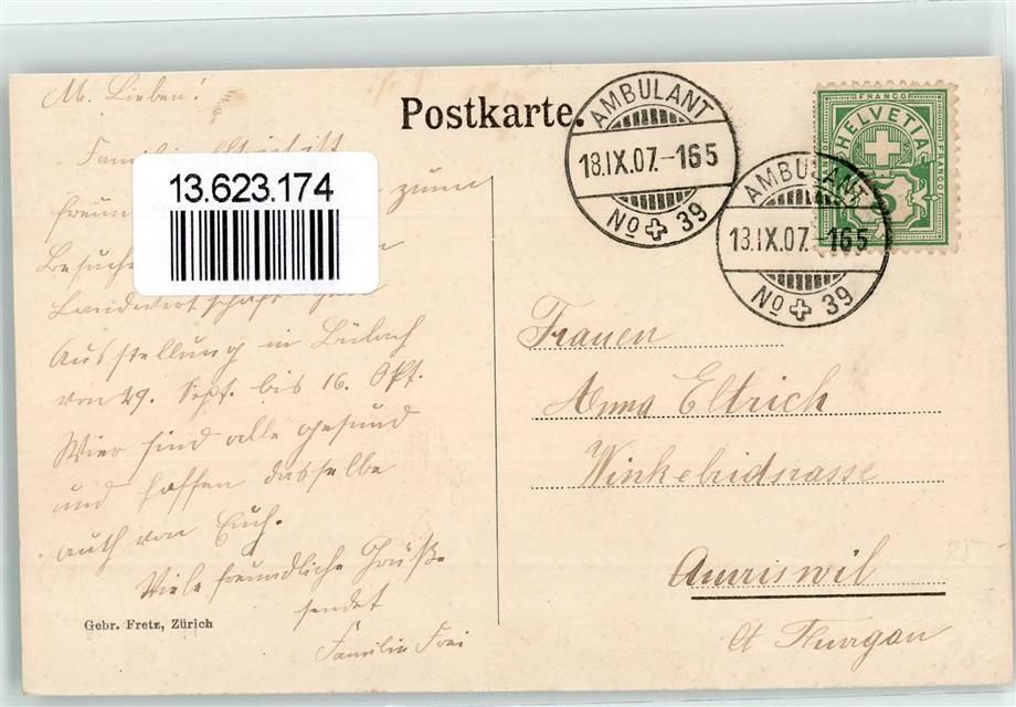 8180 Bülach 1907 - Landw.- und Gewerbe Ausstellung Bahnpost Zug 165 Nr. 39