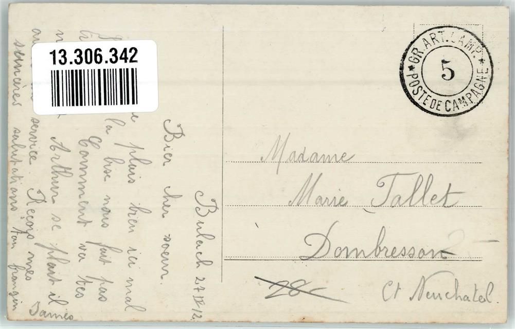 Bülach, Uniform Kanone Feldpost Gr-Art.Camp. 5 Ort handschriftlich