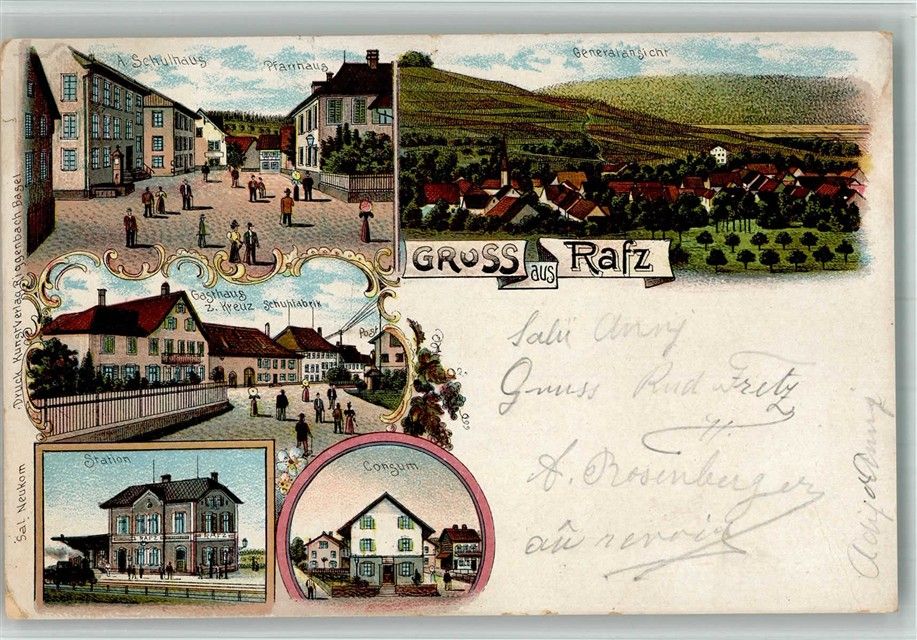 Rafz, Gasthaus zum Kreuz Bahnhof Geschäft Lithographie