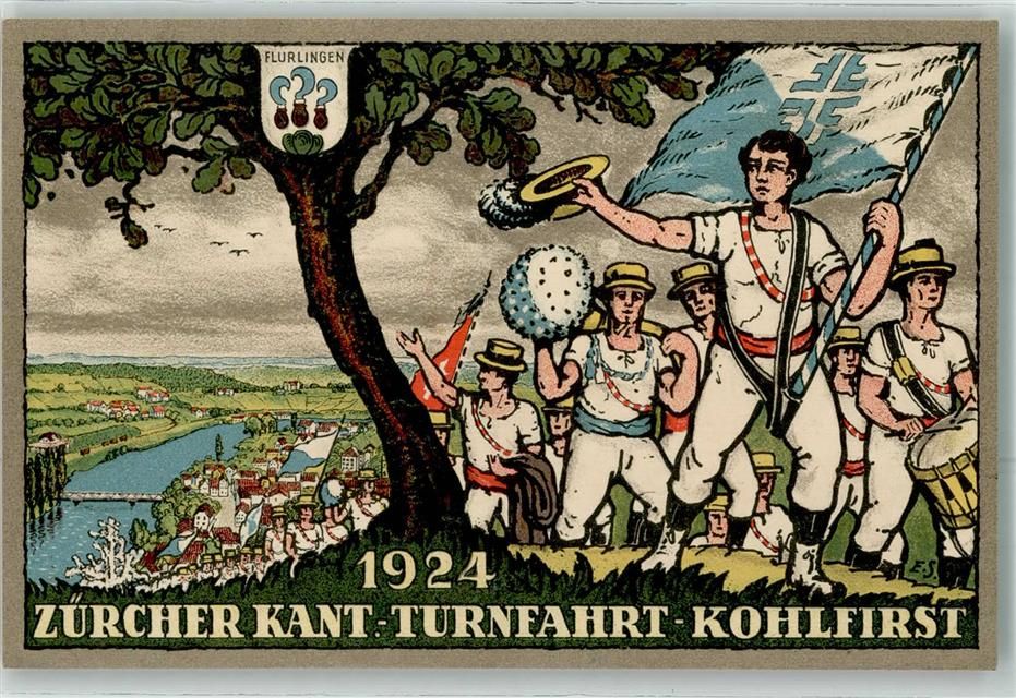 8247 Flurlingen Künstlerkarte Zürcher Kant. Turnfahrt Kohlfirst 1924 Turner Trommler Wappen