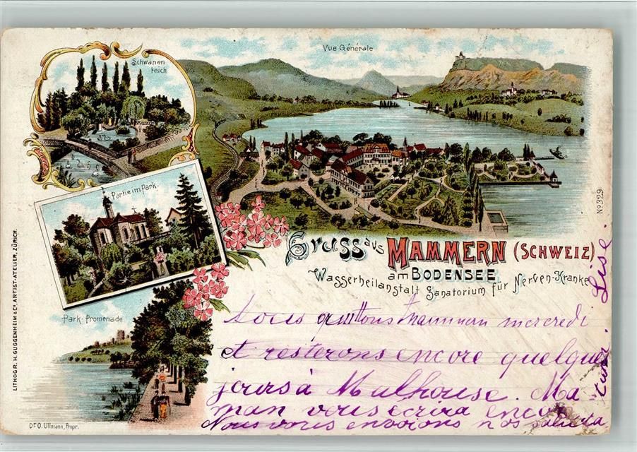 Mammern, Lithographie Wasserheilanstalt Sanatorium für Nerven Kranke Schwanenteich Park Promenade