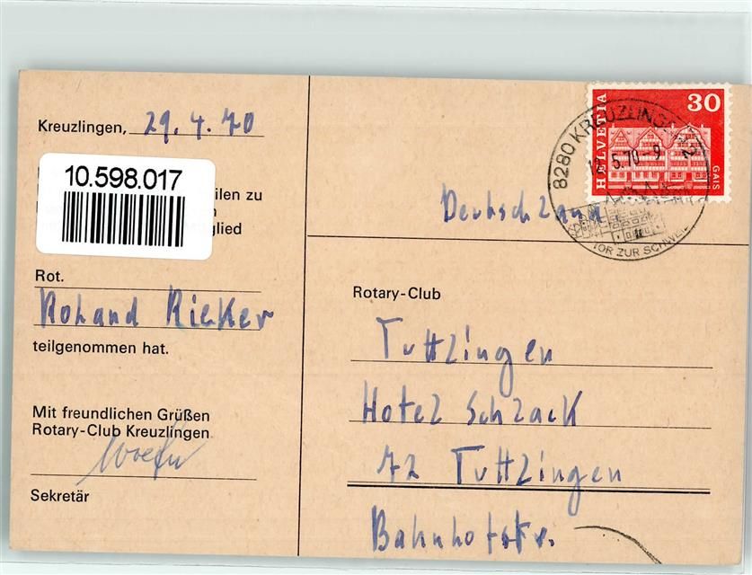 8274 Gottlieben Gebrauchsspuren Gasthaus Waaghaus Rotary Club Kreuzlingen Teilnahmebestätigung