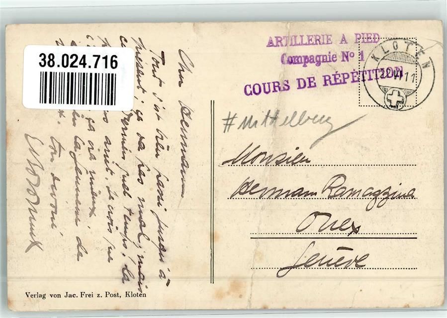 8302 Kloten Gebrauchsspuren Feldpost Artillerie a Pied Cmp. Nr. 1 Mittelburg