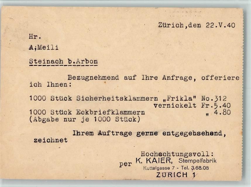 8374 Dussnang 1940 - Kneippkurort - Kaier 'Stempelfabrik Zürich - Bestellkarte