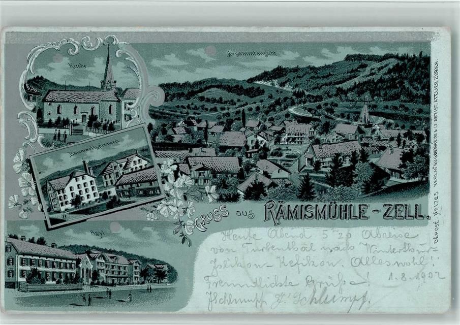 8487 Rämismühle 1902 BOAKC Lithographie/Mondschein Zell Kirche Baumwollspinnerei Asyl