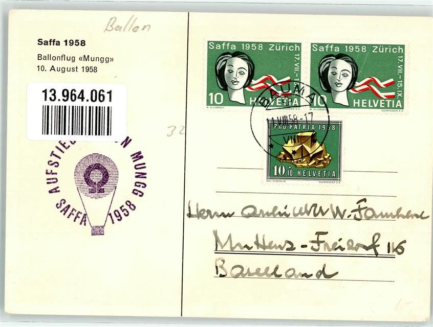 Bauma, Ballon Ort lt. Stempel Saffa 1958 Ausstellung