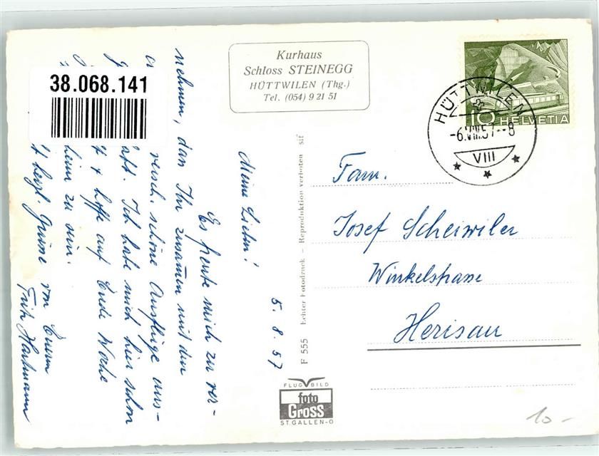 8536 Hüttwilen 1957 Foto AK Fliegeraufnahme Schloss Steinegg Kurhaus