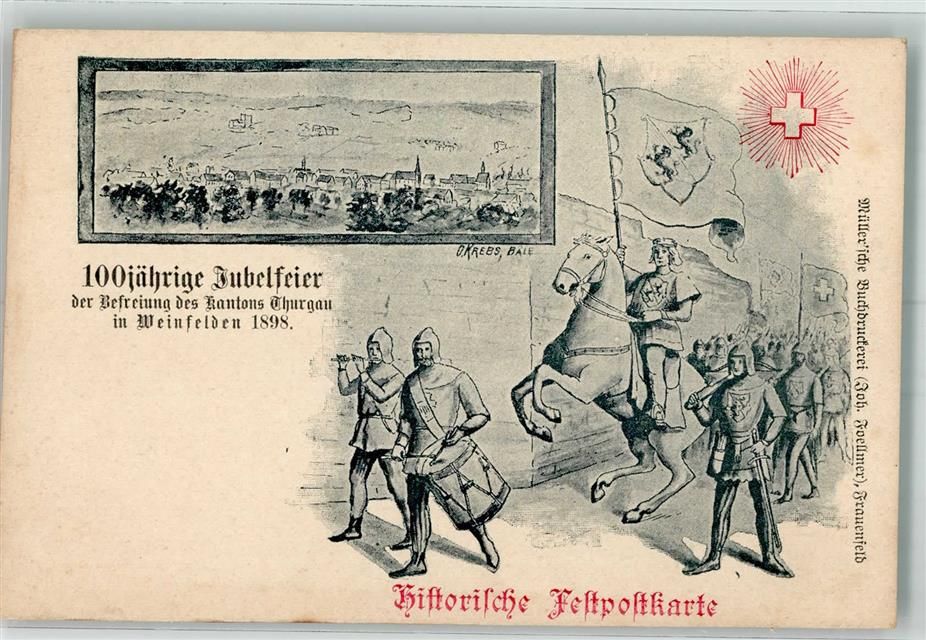 8570 Weinfelden Lithographie / Künstlerkarte sign Krebs O. 100 jährige Jubelfeier der Befreiung des Kantons Thurgau 1898