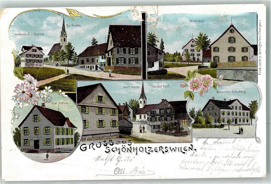 Schönholzerswilen, Ev. Kirche Gasthaus zur Sonne Kath. Kirche Schule Lithographie