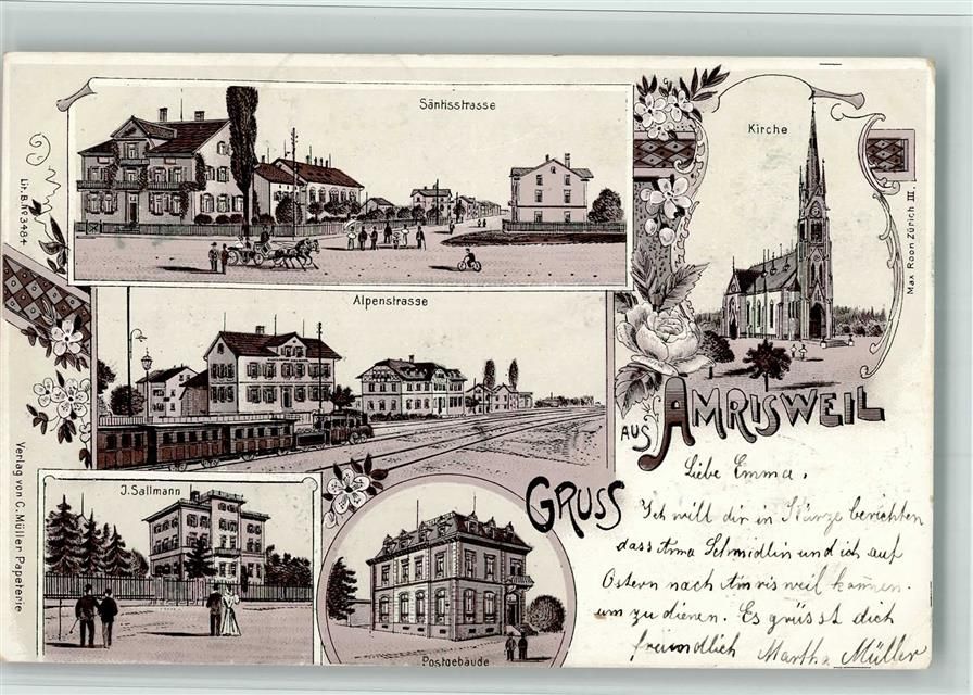 Amriswil, Bahnhof Säntistrasse Alpenstrasse Villa Sallmann Lithographie