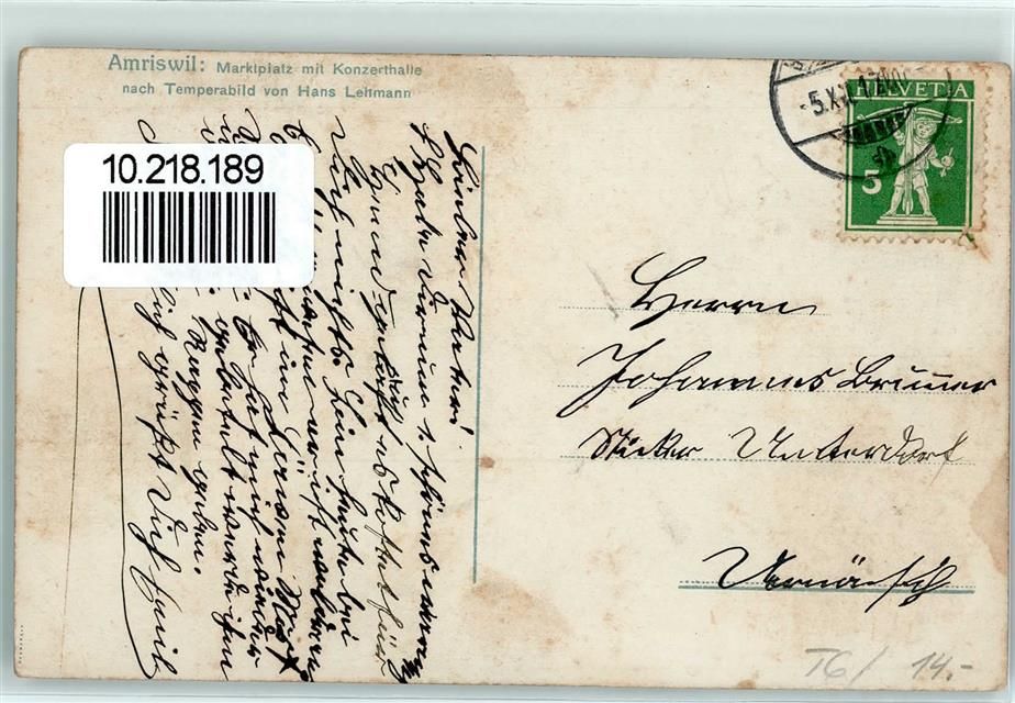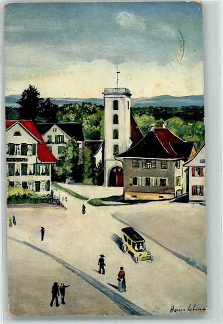 8580 Amriswil 1917 Künstlerkarte Marktplatz mit Konzerthalle nach Temperabild von Hans Leitmann